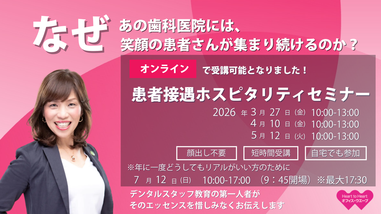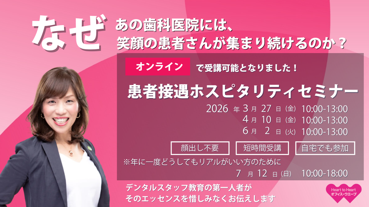 「心を育てる!患者接遇マナーセミナー」「デンタルコーチングセミナー」のメイン講師を務める。